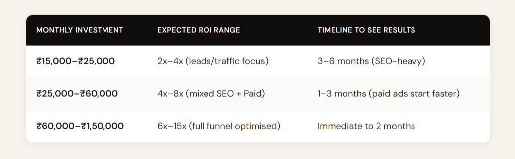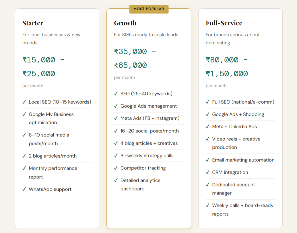 Scaling seriously? Invest ₹75,000–₹1,50,000/month in a full-service strategy. This is where you start pulling ahead of competitors who are still deciding whether to begin.