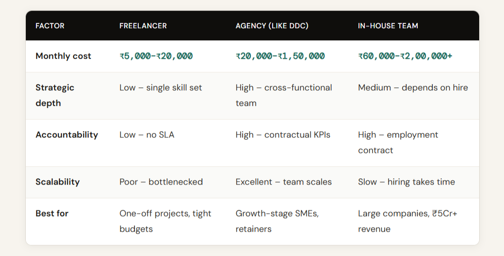 “An agency is more cost-effective than building an in-house team for any business under ₹5 crore annual revenue. You get a full team — strategist, copywriter, ads manager, designer — for the price of one mid-level salary.”