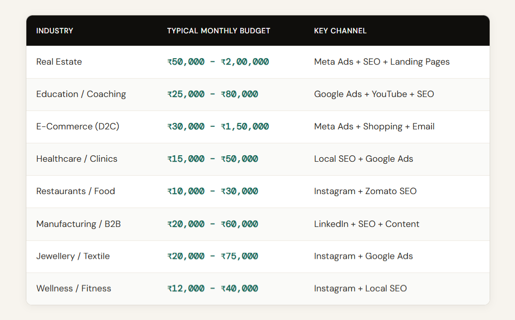 Just getting started? Budget ₹15,000–₹25,000/month. Focus on local SEO plus one social platform done well.